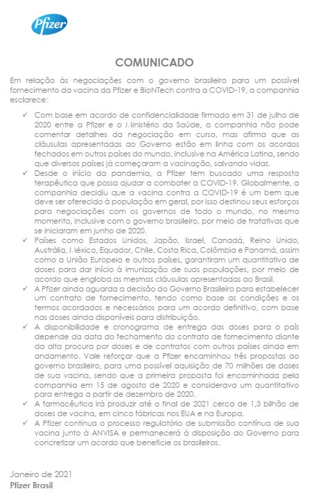 Regarding negotiations with the Brazilian government for a possible supply of Pfizer and BioNTech's COVID-19 vaccine, the company clarifies: