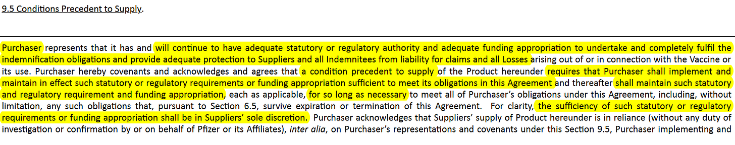 The “Purchaser (it)…will continue to have adequate statutory or regulatory authority and adequate funding…(to) fulfil the indentation obligations and provide adequate protection (to Pfizer and) shall maintain such (laws) and funding… a condition precedent to supply... requires that Purchaser shall implement and maintain in effect such statutory or regulatory requirements...sufficient to meet it obligations in the contract...shall maintain such statutory and regulatory requirements... for as long as necessary. … the sufficient of such statutory or regulatory requirements … shall be in Suppliers' sole discretion.”