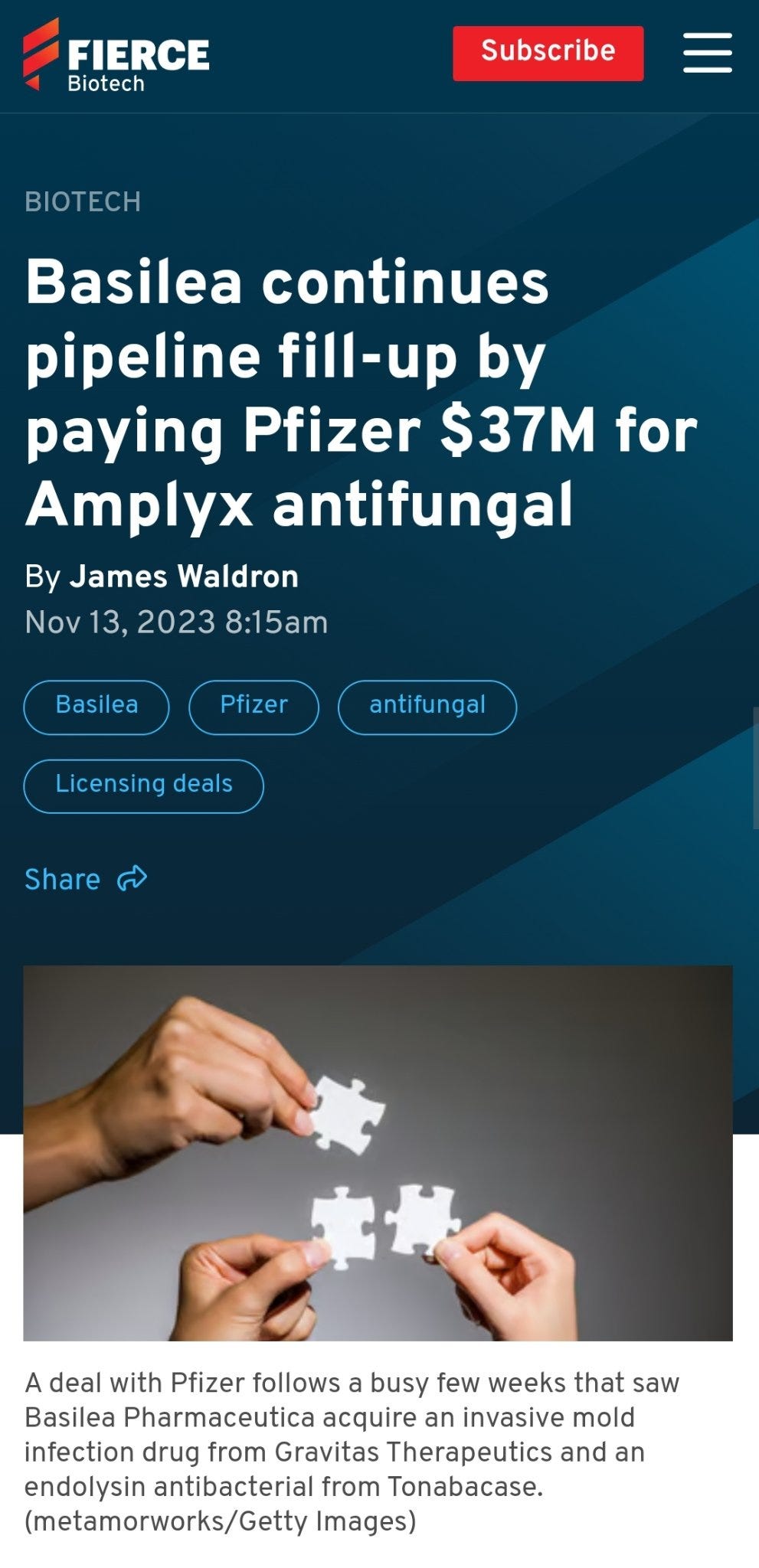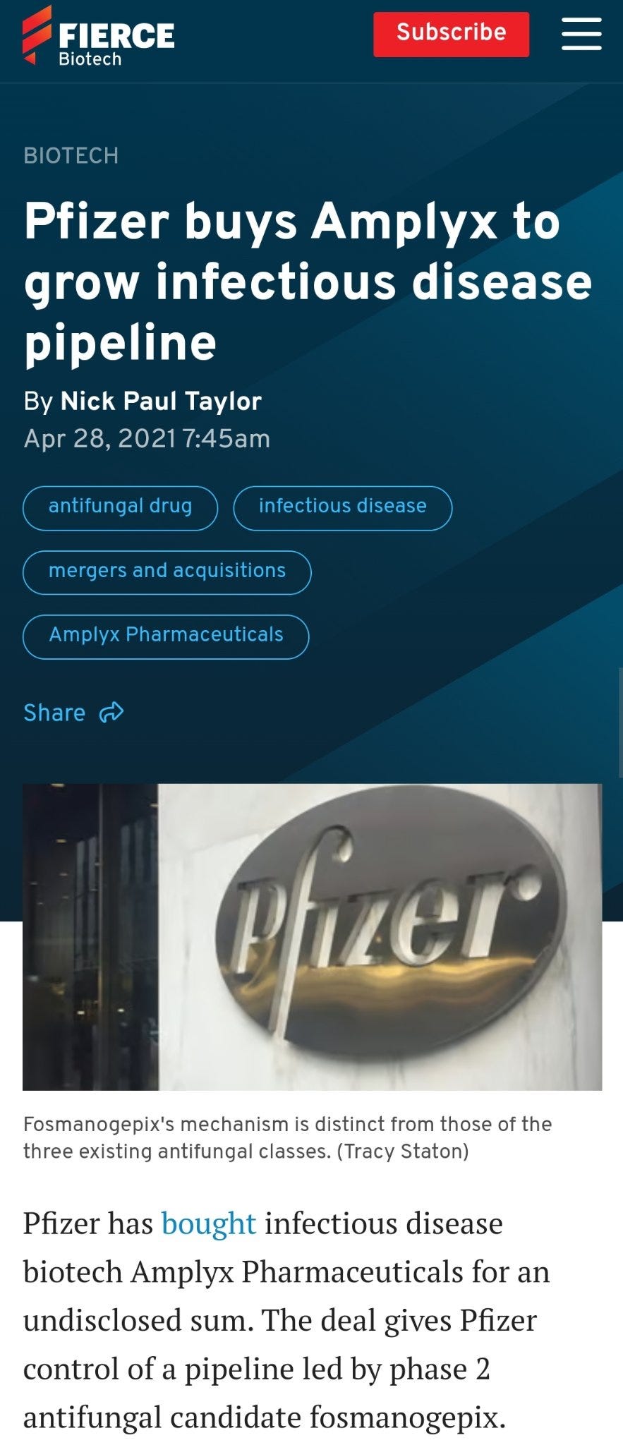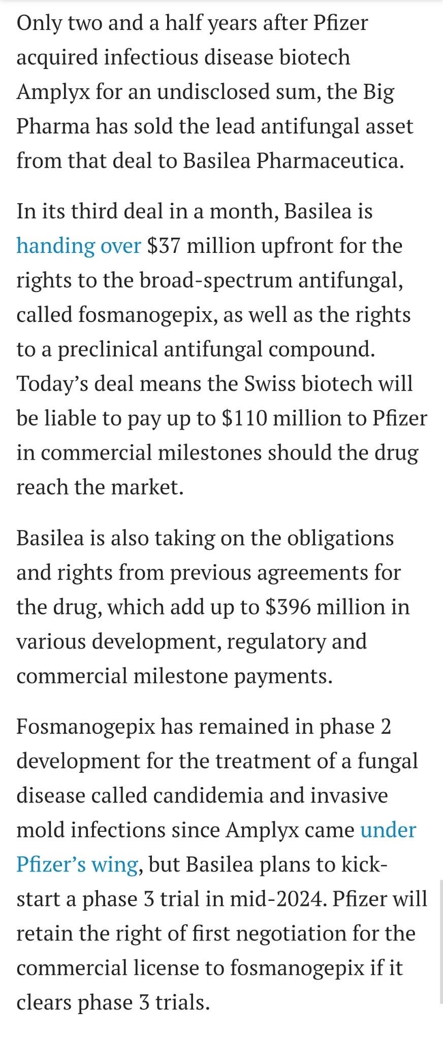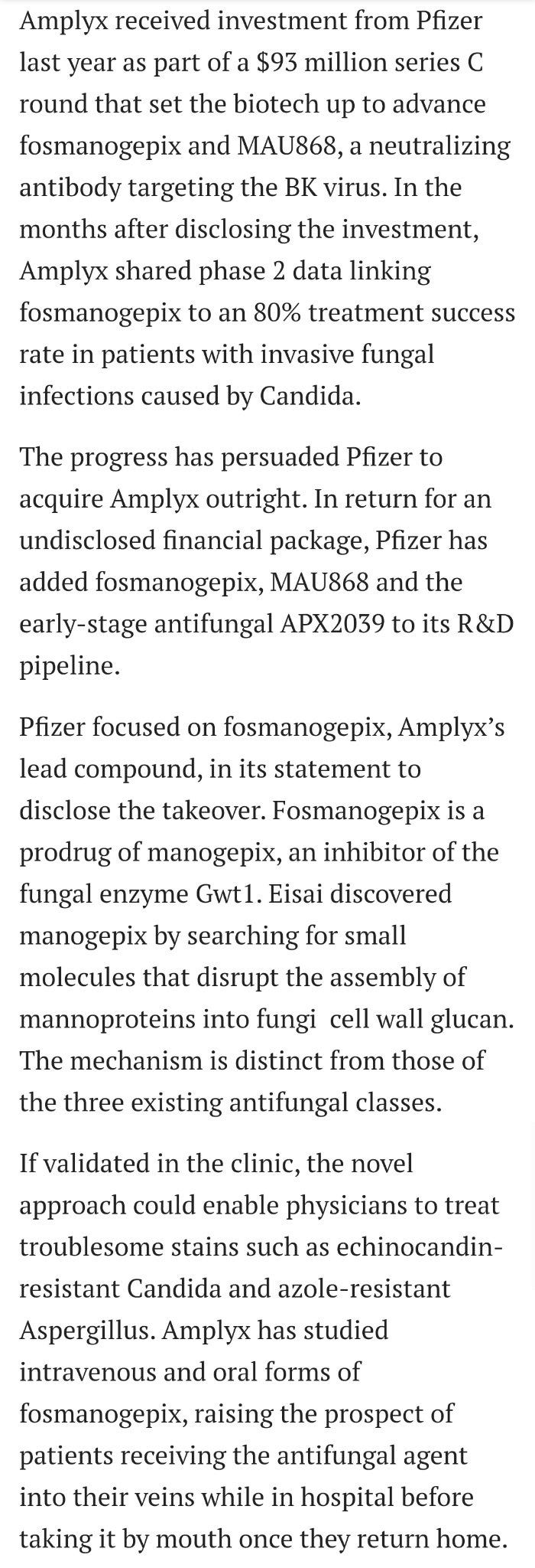Pfizer bought #fosmanogepix developer Amplyx in April 2021 for undisclosed amount after $93m investment in it in 2020, yet in November 2023 it sold the drug rights to Basilea for $37m, while keeping distribution rights if passing phase 3.
