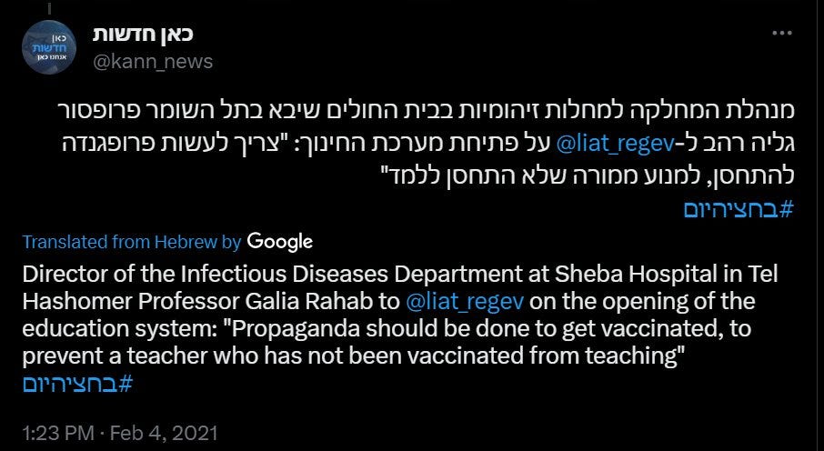 One of the Israeli doctors who took part of the phase 2 clinical trials is doctor Galia Rahav, Director of the Infectious Diseases Department at Sheba Hospital, who was constantly on Israeli TV during the #COVID19 p(l)andemic days, pushing for vaccination and for taking actions against those who did not want to take the shots.