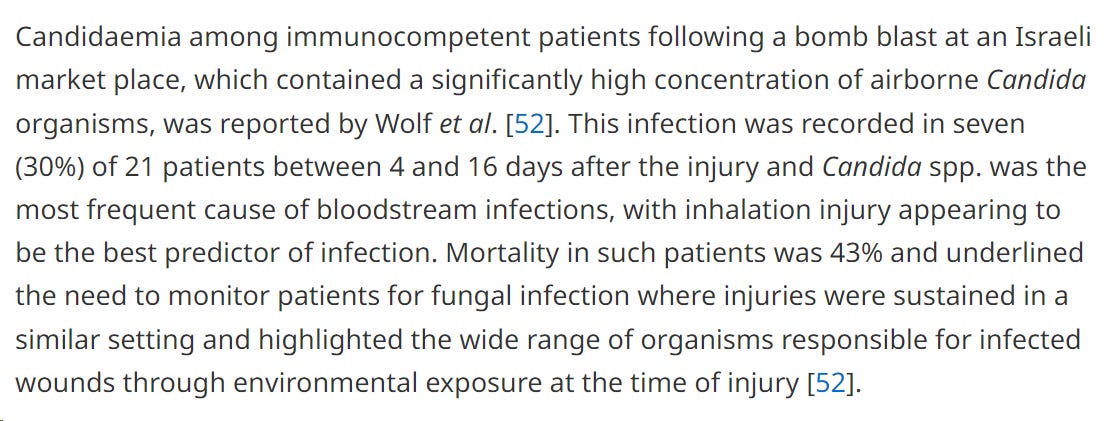 Candidaemia is defined as the presence of Candida species in the blood. This is not a new problem, read what was reported in a 2016 paper about Israelis who were injured by a terror bomb blast.