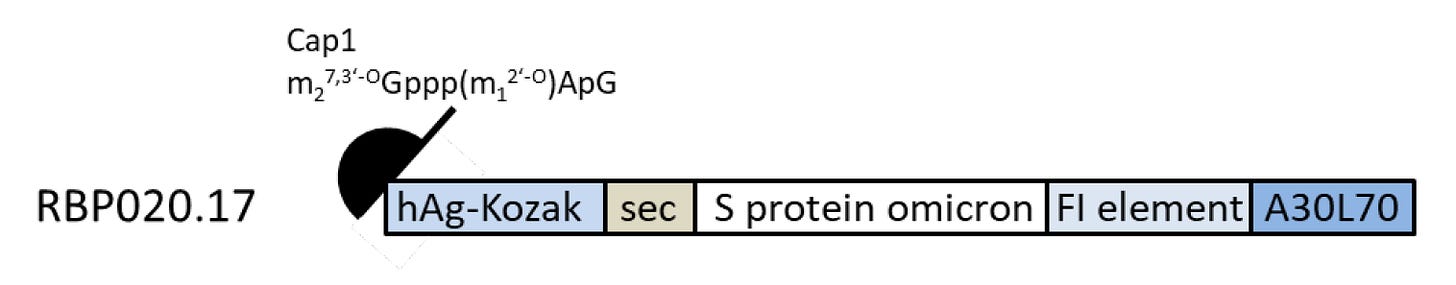 The active principle in each Omicron (B.1.1.529) variant drug substance (DS) is a single-stranded, 5'-capped mRNA that is translated into the respective protein (the encoded antigen). Figure 3.2.S.1.2-1 illustrates the general structure of the antigen-encoding RNA, which is determined by the respective nucleotide sequence of the DNA used as template for in vitro RNA transcription. In addition to the codon-optimized sequence encoding the antigen, the RNA contains common structural elements optimized for mediating high RNA stability and translational efficiency (5'-cap, 5'-UTR, 3'-UTR, poly(A) - tail; see below).