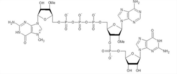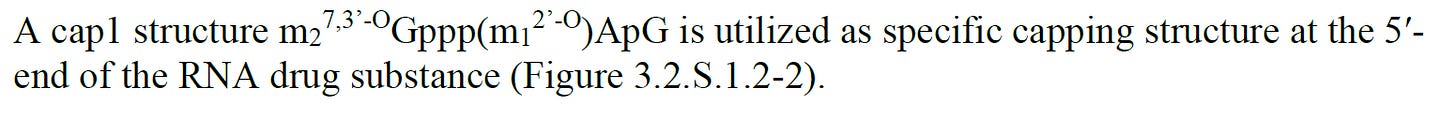 A cap1 structure m2^(7,3’-O)Gppp(m1^(2’-O))ApG is utilized as specific capping structure at the 5′-end of the RNA drug substance (Figure 3.2.S.1.2-2).